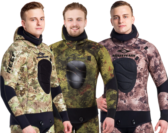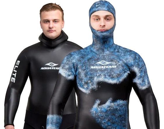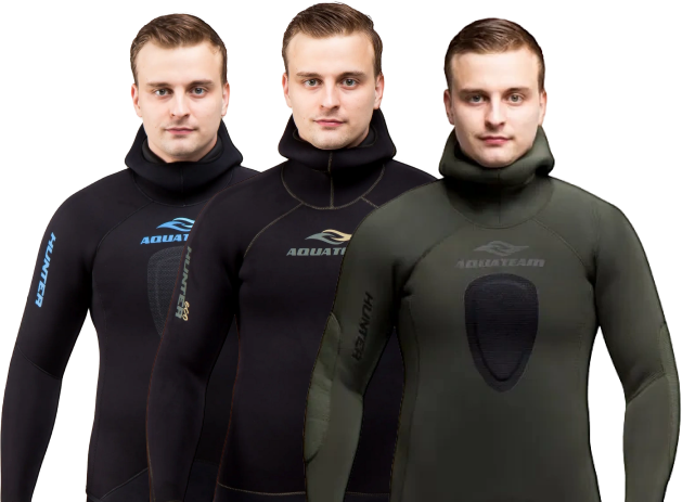 - гидрокостюмы собственного производства, изготовленные из различных материалов (нейлон, ультраспан, резина «открытая пора») и в широком диапазоне толщины – от 3 до 10 мм. Крой выполнен таким образом, чтобы специальная одежда плотно прилегала к телу и не сковывала движений пловца;